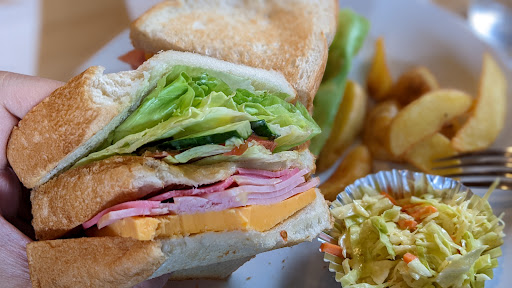 クラブハウス1180円を注文。 出てきたのはめちゃくちゃボリューミーなトーストサンド。たぶん特別な素材はなにもないはずなのになぜこんなに懐かしい味がするのか、本当に美味。 ポテトは塩味抑えめホクホク皮付きポテト、コールスローは酸味抑えめマスタードが程よい味付け。