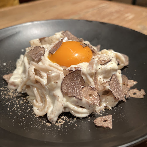 そこに卵黄、そしてトリュフをかけるが、香りがとても良く、熟成ベーコンの塩気も溶け出し、とても美味しい 食べ応えも満点の必食メニューである。