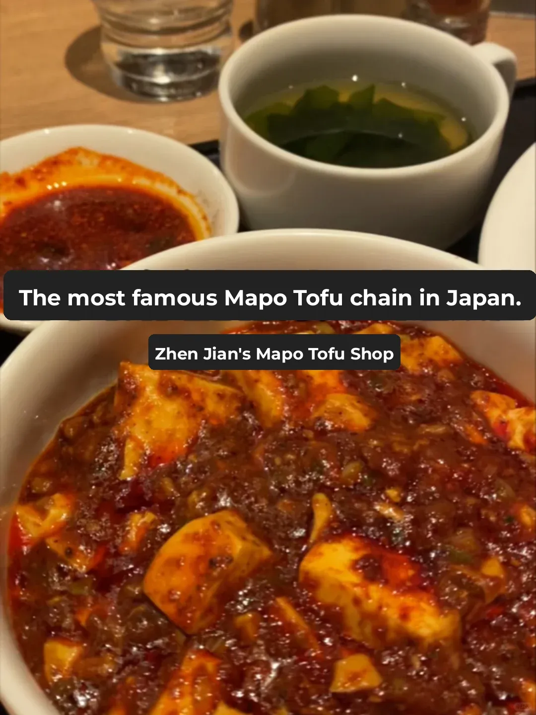 麻婆豆腐 甘口辛口大辛に特辛がプラスされた。 テーブルには特大の山椒とラー油の入れ物が用意されている。(誰需要?)
