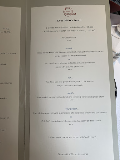 Read moreI went to Chez Olivier for my wife's birthday and we chose the Menu Dégustation (¥12,500 + 10% service fee), which included X courses.
