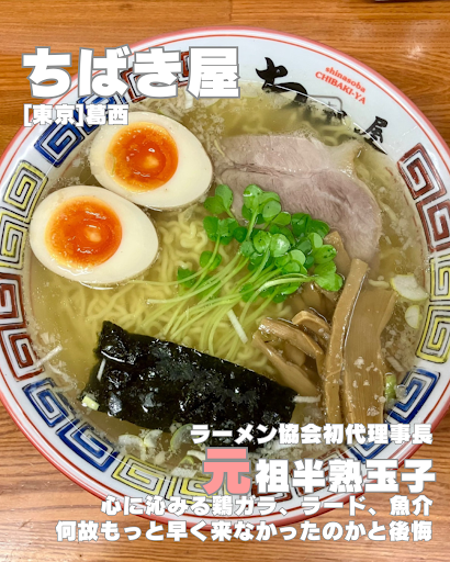 Read moreちばき屋@ 東京都江戸川区東葛西6-15-2 どうも、さぴおです ______________ 🍥ポイント ✅元祖『半熟煮玉子』和食出身の千葉店主が和の技を駆使して仕込んだ珠玉の煮玉子! ✅鶏ガラ、魚介の滋養がたっぷりと溶け込んだ圧巻スープ ✅中華ちまき、豚飯、焼売、骨付きチャーシューなど気になるメニュー多数! ✅地元民の指示抜群の良店!後回しにしていたのを激しく後悔! ✅千葉店主は日本ラーメン協会初代理事長  ̄ ̄ ̄ ̄ ̄ ̄ ̄ ̄ ̄ ̄ ̄ ̄ ̄ ̄ [点数] 86点 ☆4.1 [アクセス] 『葛西駅』(289m) [休日] 無休 [注文メニュー] 煮玉子そば 塩 1020円 [並び・システム] 訪問時外待ち5人・口頭注文後会計 [食材] 動物出汁、、香味野菜出汁、煮玉子、チャーシュー、メンマ、海苔、カイワレ、中華麺 [味] 塩