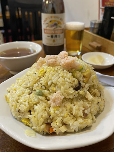 まずは瓶ビールで乾いた喉を潤し、おつまみに「春巻き」を注文。春巻きはパリッとした皮にトロッとした餡が詰まった王道の一品だね。続いて頼んだ「玉子とチャーシューの炒め」は濃いめに味付けされたチャーシューがすこぶる旨いな。この2品で中瓶1本空いちゃうよ。 そして〆にお願いした五目チャーハンはカニ、エビ、チャーシュー、玉子、ネギ、人参、椎茸、筍、ヤングコーン、グリンピースなどが入ってえらい具沢山!ただ、ベタっとした食感で味も薄めなので、卓上の調味料で味調整が必要かも。