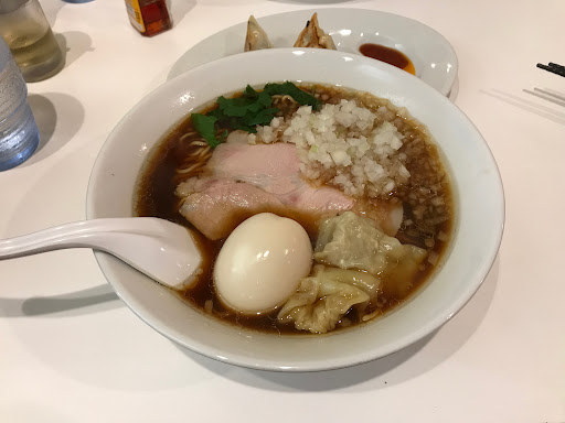 駐車場は店の裏手に3台、多摩大橋通りから向かって3軒手前の民家の駐車場(5台分)のNo.1とNo.2のみに停められる。 18:15頃入店。先客はテーブル席の家族連れのみで、空いていた。店内は明るく清潔。テーブルの間隔も広め。入口脇の券売機で食券を購入して席につく。連れはワンタン中華そば950円、自分は味玉中華そば900円と玉ねぎ増し50円、餃子2個200円を注文。席で希望の麺の種類を尋ねられる。中太麺ストレート、細麺ストレート、細麺縮れ麺から選べた。二人とも細麺縮れ麺にした。10分ほど待ち、餃子から料理が届き始めた。