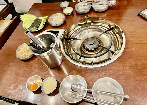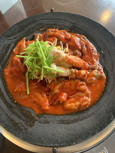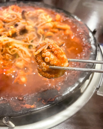 Dopo aver effettuato l’ordinazione, un’addetta ha portato al centro del tavolo un piatto di ghisa contenente polpo crudo, verdure e salsa, iniziando a cucinare davanti ai nostri occhi. Una volta cotto, il polpo si è rivelato morbido, con ingredienti freschi e di alta qualità. La salsa, piccante e speziata, ha deliziato il palato, rappresentando una vera prelibatezza per chi ama il cibo piccante.