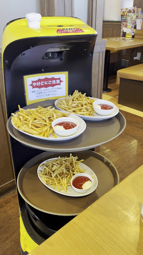 When you walk in there’s a big screen where you press how many people you have and then you sit down at whatever table it gives you. This was my own silly mistake but there were 4 huge menus on the table and i thought that’s all they had, the menus are on the side of the table. So I ordered takeout since i thought that’s all they had for what I wanted to eat. Either way a robot brings people their orders and you press the white button on the top to tell it to go away after you’ve received your food or are returning plates. The girl delivered the food to my table, wasn’t sure if I had to wait there or go to the counter. But gave her my ticket that printed out at the start and paid. Food was delicious though! Can’t remember what I ordered.. it was...