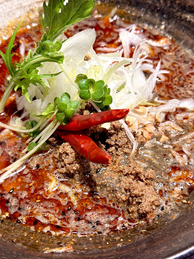 本格的四川担々麺を彷彿させる香気四川麺条の担々麺は⭐️5かな😋 今日は以前Netで紹介されていた、ちょっと気になる店名の香気四川麺条に初訪した。ピリ辛で香り豊かな四川担々麺を連想したからだ。最初は学芸大学駅近くの店を考えたが、祖師谷、経堂、千歳烏山、沼袋にも系列店があり、京王線を使う機会があったので、途中下車して旨飯探訪した。千歳烏山店は駅北口から数分で近い。遠くからでも赤と黒の担々麺色の外観が目を引いて、ピリ辛の四川担々麺を連想させる。13時に入店したら、カウンター9席のうち6席が埋まっていた。中年の大将が調理し、女将が食券を受け取って配膳する。多くの口コミで味は良いが接客態度が悪いと書かれていたが、そんなことはなかったな🤔。女将は愛想が良く、食券を出すと縮れ麺かストレート麺か聞いてくれる。Zはスープが良く絡む縮れ麺だ。女将が大将に伝えるとアイヨー、ヨッシャーという寿司屋の板前さんのような元気な声が返ってくる。明るくて気持ちがいいね。これなら美味しい担々麺に期待大だ🤗。Zの食券は辛口紅担々麺890円に、スマホのクーポン券を見せるとパウチー、ネギ、もやし、きくらげ、たまごの中から1品選べるのでパウチーとした。ランチタイムのみミニ麻婆丼が330円から220円のサービス料金なので、これもchoiceだ。待つこと数分で写真の如く配膳された。ウワォ❗️一目見て、その色合いと香気風味が漂う本格的四川担々麺とわかる。どれどれスープを一口いただくと、ピリ辛で担々の胡麻の香りとコクが溶け込んで旨いね😋。スープは見た目よりスッキリしていてドロ系ではない。元々パウチーとネギが入っていたが、レタスのようなシャキシャキシャキ感が堪らない。パウチーをサービスで追加できて👍だよ。縮れ麺に胡麻担々スープが良き絡み、都内の担々麺専門店と遜色ないね。卓上の花椒や青山椒をかける必要がない麻辣味だ。但しミニ麻婆丼の麻婆はあまり辛くはなく、卓上の香辛料を麻婆の半分ずつかけて辛さ🌶️調節した。220円のランチ🈂️ならお腹を満たすのに✌️だね。食べ始めてから徐々に額から💦がふきだしたが、スパイスカレーのようなピリ辛感でとても美味かった💯。今日もご馳走様でした🙏。 今日は辛口黒胡麻担々麺を食べに2回目の旨飯探訪。13時に入店し、ほぼ満席だったが1席空いていた✌️。券売機で千円入れたがお釣りが20円しか出ない?。辛口なら930円なのにおかしいな🤔。ヤッテしまった😮。隣の激辛ボタンを押してしまうなんて😞。こうなりゃ激辛980円で勝負だ❗️スマホのクーポンでパウチーが🈂️、辛口蒸し鶏500円もchoiceした。🈂️小ライスも付いて写真の如く提供された。まずは激辛スープを啜ってみると、黒胡麻と花椒など香味料がバランス良くたっぷり溶け込んでいて旨い😋。激辛といいながら横浜中華街の担々麺と同格の辛さだし味も遜色ないよ。豚挽肉が縮れ麺に良く絡み、パウチーのシャキシャキ感が舌妙だ👍。途中から💦が額から心地良く溢れるのが寒い日には嬉しいね🤗、スープまであっと言う間に完飲してしまった。辛口蒸し鶏は辛味噌タレがかけてあるが、あまり辛いとはいえない。しかし激辛担々スープの味が口に残っているから、麻辣香味料を追加するより香味酢をかけた方が蒸し鶏の辛味噌が引き締まる。これをライスに乗せるとZ流辛味噌香味酢の蒸し鶏丼になった。店のメニューをスピンオフした食べ方を探すのも楽しかりけりだね😊。今日もご馳走様でした🙏。追伸、メニューの値段が少し値上げしていたのは物価...