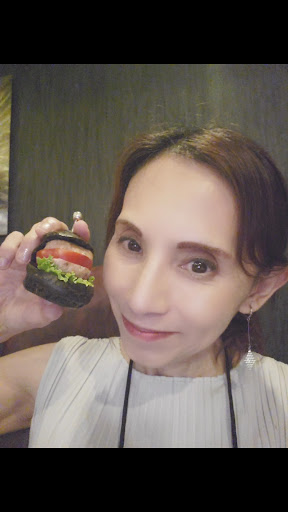 🌹調和 山形県平田牧場金華豚 竹炭ミニバーガー。 日本で2ヶ所しか生産されていない豚。10日間、ハーブとスパイスでマリネして、おからでひいたサルシッチャ 生地には、牛脂と竹ずみを練りこんだもの。小さい粒状はミツバチが集めた花粉。(健康にいいよ。) ミニバーガーは、紙袋に包んだまま頂きます。平田牧場の肉は、旨味たっぷりて、口の中でとろけました。