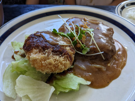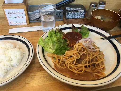 Read moreランチの定食が¥850と安く、とても優しい美味しさ。コスパって言葉に騙された事があるから嫌いなんだけど、ここを表すならこの言葉かな。クリームコロッケが付いたハンバーグ定食。ご飯はふっくらと美味しい、お麩の入ったお味噌汁は優しい味。クリームコロッケはザックリと音がしそうな歯ごたえの衣。これは手作りなのかな?スーパーの惣菜で売ってるへにょへにょのクリームコロッケよりも味も濃厚でこっちのが好き。瑞々しいグリーンの上にイタリアンっぽいソースのハンバーグ。味は良い。実は近所のウッドストックに行く予定が、13:10分に行ったにも関わらずランチ終わってたので、このお店に急遽変更。お腹がハンバーグ一択だったので、こちらに寄れて良かったです。 正直に言えば、スペシャルな所では無いかもしれない。1Fはカウンターだけで狭いしね。でも値段も味も優しさに溢れていて、家庭の味に飢えたサラリーマン、お腹を空かせた学生さん、そう言う人達を暖かく迎えるのをコンセプトにしてるのかな。そんな空気が好ましかったです。惜しむらくは、ハンバーグのソースにパスタが混ざってる所。お弁当とかでハンバーグや揚げ物の下にパスタが敷いてあるけど、あれって油切り兼笠増しだよね。それをソースに混ぜちゃうのは、うぅん…どうかな、って思った。これもお客にお腹一杯になって欲しいから、って心遣いの一つだろうなって思ったけど、ソースの味は良いのだから、パスタは同じ皿に別に添える、とかで良いかと。まぁ、そんな理由でマイナス☆一個。 色々書いたけど、近所の人を幸せにしてくれる、そんな良いお店です。長く続いてるのが良く解る。近くに寄ったなら、一度入ってみるのをオススメします。...