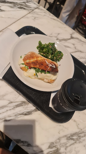 Read more東京駅(丸の内口)、大手町駅のいずれからでもアクセスしやすいカフェです。特に休日はカフェ周辺の通りは歩行者天国となり、自然とこのカフェを含む周辺の飲食店は利用者で混雑しますが、天井も高く広々とした空間設計であるため、客同士がお喋りに興じていても、酷い喧騒を感じることはほとんどありません。数は少ないですがオープンテラス席があり、また前述の通り休日はカフェ周辺の通りは歩行者天国となっているため、テイクアウトでコーヒーを注文する客も多く、一日を通して席の確保が困難であるほど混雑しているわけではありません(それでも客の回転がとても良い、というわけではありません)。アメリカ発祥のカフェだからか、海外からの観光客の利用が多く、メニューも日本語だけでなく英語も併記されています。一部のカウンター席には充電用の電源コンセントも設置されています。 給仕される料理やドリンクの種類は豊富で、特に料理はパンやパン生地を使った料理が主です。事前に注文を受け付け支払いを済ませるスタイルで、すぐに給仕できる料理やドリンクは給仕カウンターで受け取り、給仕に時間を要するものはスタッフがテーブルに届けてくれます。混雑した時間帯でも給仕のスピードが遅くなることはあまりなく、スタッフの手慣れた接客対応が見て取れます。一方で給仕される料理(特にパン)が固かったり、過熱にムラがある場合があります。
