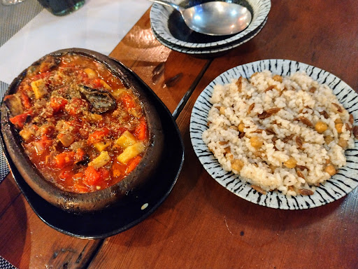 ●パットルジャンムサカ(ナスのムサカ) ムサカってギリシャ料理じゃないの? と店主に伺ったら、 トルコだと力説いただきました! ラム肉とナスとトマト こちらもたまりませんね。 ピラウと一緒にいただきます。 ポリューム満点料理ですね。