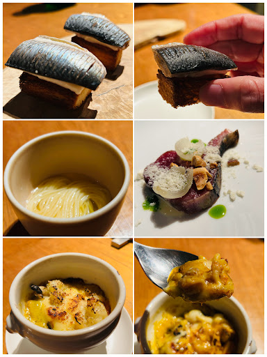 ■鰯 平さんがイタリア修行中の賄いで好みだったパンにバター&アンチョビを重ねた”ブルスケッタ”をイメージ。 下から…薪火でトーストした”ブリオッシュ”、発酵バターとスペイン産アンチョビに栗の甘露煮。 ”ラルド(豚の背脂を使った生ハム)”に、赤ワインビネガーでマリネした”鰯”を軽く薪火の窯で温めて少し脂が蕩けて表面に浮いた仕上がり。