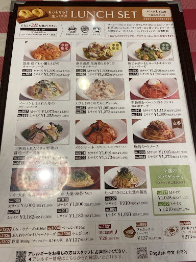 Read more初めて利用させていただきました。 京王多摩センター駅 中央改札を出て階段を降りれば直ぐにあります。 お店の雰囲気はカジュアルイタリアンというところでしょうか。入りやすいです。 カウンターもあり奥まで広いのでキャパもありそう。 入店がAM11:00過ぎでしたのでまだ混雑しておらず、お一人様でしたが直ぐにホール担当の方が来て4人掛けの広い席に案内してもらえました。 逆に恐縮です。 ピーク時は店頭にあるタッチパネル式の受付の様です。 ペペロンチーノが好物なのでランチセットの浜名湖産 生海苔とあさりのペペロンチーノ(L)をオーダーしました。 MサイズとLサイズが選べるのは嬉しいです。 ランチセットのサラダ、アイスコーヒーを頂きながら程なく料金が提供されました。 あさりはやや小ぶりでしたが沢山盛ってくれています。生海苔も風味があり美味しさを引き立てていました。 パスタの量も丁度良く空腹を満たせました。 欲を言えばフォカッチャがランチセットで付いていると嬉しいですね。 駅からも近く気軽に入れるお店なので、次回別のメニューを試したいと思い...