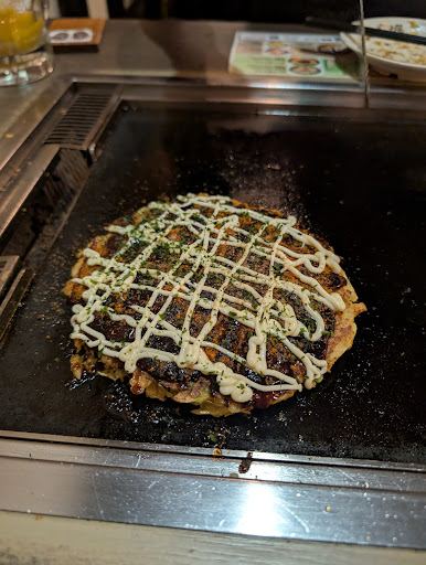 I didn't know how to make my okonomiyaki and the waiter was very helpful and spoke English. First, you put oil and spread it across the teppan surface. Mix your okonomiyaki well then put it onto the teppan. Use the spatulas to make it round and wait about 5 minutes then flip it over to cook some more. In the picture I took, the oil container is the one on the right. The other container has yakisoba sauce. Add the okonomiyaki sauce which is in a squeeze container along with the katsuoboshi (dried bonito flakes) and aonori (dried green seaweed) which are in...