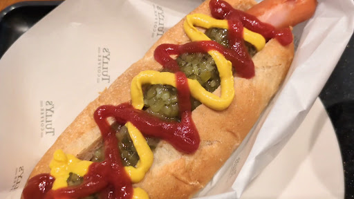 口に頬張ると、ピクルスの青い酸味、ケチャップの濃厚な旨味と熟成された酸味、マスタードの香りとほどよい辛味が口内を賑わわせ、しかしそれらはあくまでも脇役で、パチっと弾けてほとばしる肉汁と、粗挽きで肉々しいソーセージの旨味と混ざり合い、味も「これぞホットドッグ」となります。