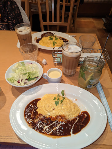 The dinner set (between 1400 and 2100 yen) is moderate value. It includes a drink and either cake or soup and salad. My husband had the Hamburg Omrice and I had the Mushroom Omurice. Both were fresh and packed full of flavour.