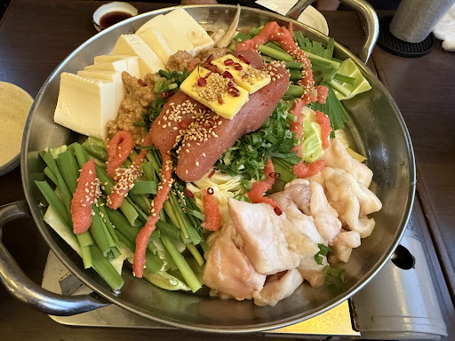 ⑤明太子モツ鍋(2人前) 博多といえば明太子とモツ鍋、その2つを組み合わせた贅沢な一品。最初は中火とコトコト、後半は弱火で調整して頂きました。プリプリのモツは食感、歯応え共にベスト!明太子も他の味に負けることなく旨味はしっかり出ていて、野菜との相性も意外とバッチリで完食しました。モツ鍋は季節問わず裏切らない美味しさですね!