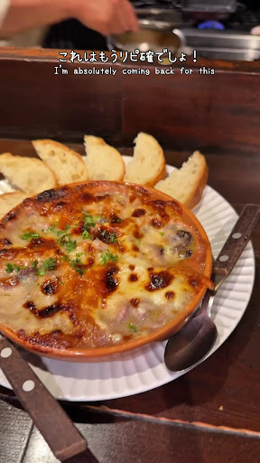 The oven-baked dish was loaded with cheese, and it was so good piled onto baguette slices
