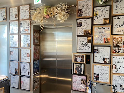 エレベータを降りると直接店内であり、壁には多くの有名人のサインが並んでいます。 このサインですが色紙だけじゃなくて写真も追加されており、実に分かりやすいのに感心。 このようなところにも気遣いが見て取れます。