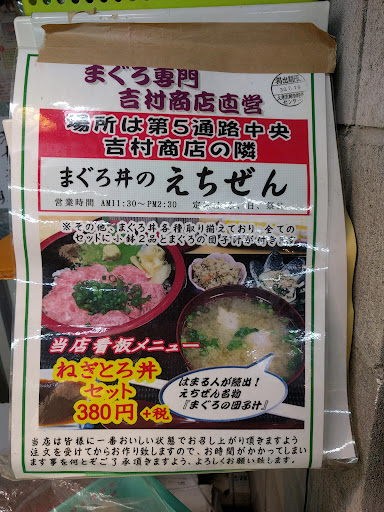 小さなまぐろのさく200円台〜と丼はネギトロ丼380円と二色、三色丼580円(時間で値下げで500円と言ってた)を売っている。お兄さんがいい笑顔でずっと喋っているが、こういう元気な人が売るものは美味しいと決まってる。