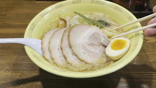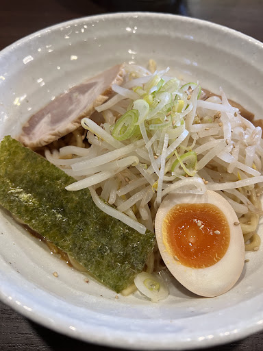 Read more調布市の品川通り沿い。京王西調布駅に近く南に徒歩数分。飛田給方面から来ると、中央道の高架を潜ってすぐあたりにある。駐車場は店の横に7.8台ほど、全面道路は広くはないが比較的駐めやすい。 土曜日の夕食に訪れた。20時頃だったが、駐車場は最後の一台、お客さんの入りは3割ほどの感じ。それだけクルマで来るお客さんが多いと言うことだろう。男性客はもちろん、ファミリー、女性のおひとり様など客層は広い。小金井本店にはよく行くが、こちら調布のお店に来たのは初めて。 黄色い看板に屋号の黒字の毛筆書体まで同じ。空いてるなと思い着席しようとしたが、先に食券方式。タッチパネル式でPayPayまで使えるハイテク機である。そこに数名並んでいる状態で、ちょいと時間がかかってしまう。 メニューは麺類はほぼ小金井と同じだが、定食は無いようだ。初訪なのでオーソドックスにラーメンにする。ただし肉を欲しているのでチャーシュー麺1300円を奮発、大盛り100円増しにする。麺は太麺をオーダー。 トッピングのチャーシューは4枚で脂多めの部位、そこに元からの半熟味卵半分、メンマ、もやし、海苔一枚が乗る。 スープは背脂醤油、色的には鶏ガラのようだが豚骨のようにも思えた、色々使っているのかもしれない。啜ってみるととても濃く、これは正解なのか?との印象。確かに出汁は効いてるのだが、個人的には塩味強すぎ。麺は長崎チャンポンの麺と同じくらいの太さで固めの茹で上がり。中低加水の太ストレート麺といえばいいだろうか、いい歯応え。麺が強いのであえて濃いめにしたのか、真実はわからない。チャーシューが冷たくて残念感、時期的に仕方ないところはあるが。 卓上調味料は胡椒や一味など。ニンニクが無いのは本店と同じ。一味はスプーンですくって入れるタイプ。麺大盛りにしたが、量的に今ひとつ物足りない。やはりご飯を付けるか、油麺特盛にトッピ...