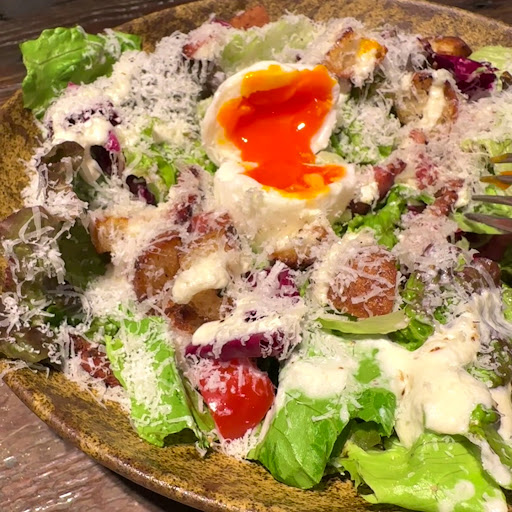 ⚫︎本日のシェフサラダ シーザーサラダ → ベーコンが芳醇、ポーチドエッグに、 フレッシュな葉野菜とパルメザンは繊細で高バランスな一品。