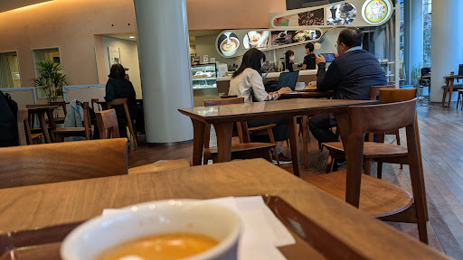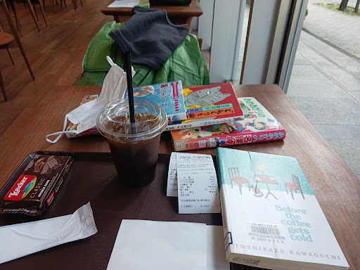 Hard to judge the size. About 20 tables, but not all of them have four seats. There are also some extra seats that look less comfortable in the lobby just in front of the coffee shop. The bad directions from Google Maps still show coming in from the back side, but the normal entry is from the front lobby on Omei Kaido, the main street that continues down to the station. Very airy, modern, and open atmosphere, but kind of noisy. I sat in a very bright seat next to the big windows. The building is a kind of public concert hall and this coffee shop is at the back of the ground floor lobby. Wi-Fi is available, but I think the short password makes the security weak. No charging.