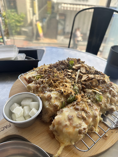 •Chocolate Nutella shake- divine. Get it. The brownies and cookie on top were pretty good too, not like the average brownie in Japan (more Korean style, closer to Western) •Mint chocolate shake- my friend said it was good. The top and outside have caramel sauce drizzled on, but it isn't mixed into the shake, probably for the better (as she said) •Kimchi chijimi- had a very high ratio of kimchi! It was so tasty! Go for it!! It would be nice to have more dipping sauce though, served in a wider bowl. •Fries- The cheese was pretty chemical-y, which is fine in a junk food kind of way. The fries were crispy. I'd rather order something more Korean next time as these were just cheese fries, but they were nice anyway. The cheese seems to come standard, there weren't regular fries on the menu and these were just called "fried potato" in Japanese. •Atmosphere: one room inside looks like a modern Korean restaurant, another room has a kind of American-garage vibe going for it. Terrace seats available, smoking allowed outside. •Payment:...