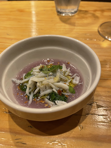 I stumbled upon this place and could not be any happier I did. The food is outstanding and overall this is a very special place. It's tucked away on the fourth floor of an office building but feels like it's a hidden gem miles away. The amuse I received was a pickled mackerel drizzled with EVOO and tried herbs and seeds and was the first wonderful surprise. I started with my server's recommendation of warm smoked/habichi-grilled eel with Yuzu vinaigrette and chives - phenomenal! This was followed by a big stalk of white asparagus with a Bolzano sauce - delicious! The spaghetti with crispy mushrooms in an anchovy sauce could not have been any better. As you sit at a counter you can watch the food being prepared and I saw some amazing items being served that I would love to try if I ever get a chance to go back. The wines offered fit the menu well and the server was very competent and kind. The price level is very fair given the quality and generous servings. All in all a wonderful experience and I thank the...