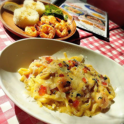 15時からのディナータイムメニューの ガーリックシュリンプと、シュリンプカルボナーラを 頂くことに。 えびが大好きなので、とっても楽しみに待ってたよ。