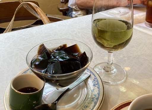 そして最後はデザート。山ブドウのソースをかけた苺の杏仁豆腐とエッグタルトが出されてきました。 さらにこのタイミングで、サービスのホット野草茶をティーポットにて提供いただきました。ホットだと、お茶の香りが引き立って、また素敵ですね。 ゆっくり心地よいティータイムを過ごせました。