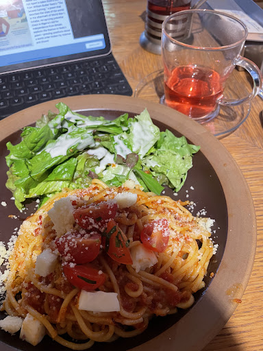 The service was minimal, and not necessarily friendly as is typical with Japan, but I personally don't mind because I'm introverted and they were still polite and efficient. As for the food, it was pretty pricey (especially the tea, 700円), but I think that is a sort of "fee" for using the space because many people tend to stay for longer periods of time to relax, talk, or work (2 hours at most). But the pasta and tea was very tasty and served hot!