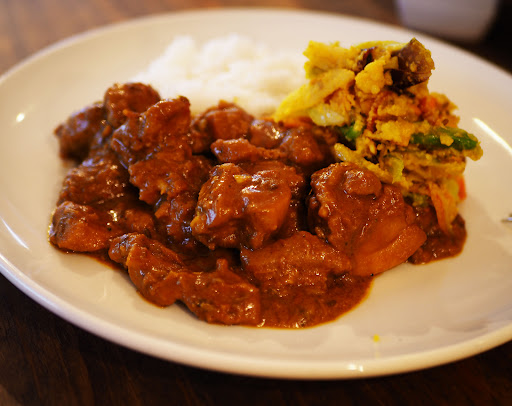 平日のランチメニューのカレーはパキスタンだかスリランカのレシピを伝授され作ったらしい。オリジナルブレンドのスパイスと野菜の水分だけで煮込むポークカレーは肉肉しくもあり、まさに絶品。街のカレーともインド料理屋のカレーとも違う。