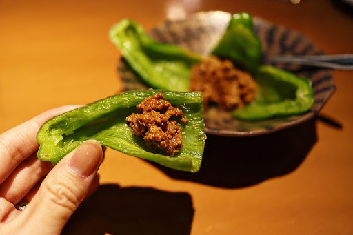 おつまみ代わりに「自家製肉味噌マヨのパリパリピーマン」こちらの肉味噌は辛すぎず キリッと冷やされたピーマンに乗せてパクッと。肉味噌多めなので お通しのキャベツにつけてもGOODでした。
