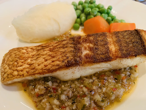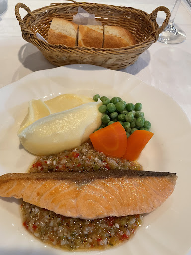 メインが登場、美しいのだ✨ ほかほかトロトロの滑らかなマッシュポテト グリンピースと人参のコントラスト 見るからに艶々と脂の乗ったサーモンに、たっぷりの彩りのソースが たまらん(≧∀≦)