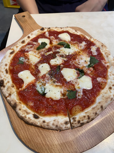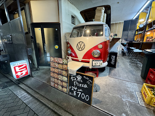 Playful eatery offering pizzas produced in a repurposed VW camper van, plus bar seating.