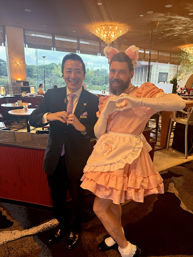 The Garden Lounge at the New Otani Hotel in Tokyo is a stunning blend of serene Japanese gardens and chic elegance, with lush greenery and glittering chandeliers setting the scene. I wasn’t there, but my brother Mitch—fresh off losing a ridiculous bet—decided to brave it alone, showing up in the most mortifying outfit imaginable: a frilly pink maid costume, complete with cat ears, lace gloves, and a poofy apron with frilly petticoats. This bearded man waltzed in, blushing furiously as the staff immediately seized the opportunity to embarrass him further. They dubbed him their “VIP feline maid,” served him at a reserved table for all to see, and even had him posing for pictures with bonsais—heart hands and all—while he giggled like a schoolgirl, clearly loving every second of the attention! The staff’s playful teasing was relentless yet warm, turning his humiliation into a riotous spectacle.