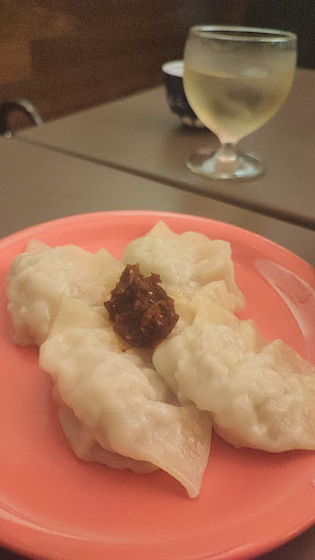 ◇モモ+エヅェ 豚肉、玉ねぎを包んだ蒸し餃子で、どんな方でも食べやすい素朴な美味しさです 赤いものは、粉末唐辛子を玉葱と油で炒めたものでこちらを付けて頂くと、一気に異国感が増しブータン料理になります