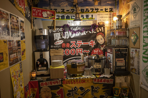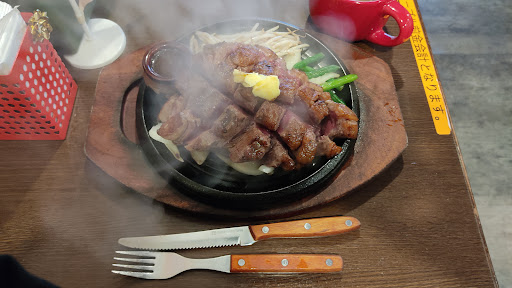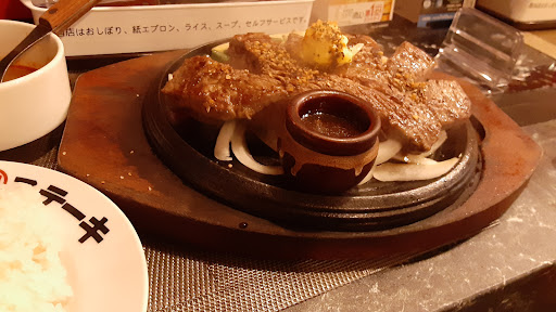 曜日ごとにサービスメニューがあり、火曜と金曜は特定部位の1ポンドステーキが500円引き。スープとライスはセルフで食べ放題!肉は赤身で柔らかく、日本人好みのステーキというよりも肉好きのためのステーキと言った感じ。200gから2ポンド(1ポンドは450グラムちょい)まで選べる。付け合わせの野菜はモヤシと玉ねぎ、いんげんで、肉に比べたら控えめ。 岩塩やペッパー、醤油、柚子胡椒などテーブルに用意されているが、ステーキソースは少なめなので、ソースで全て食べたい人には物足りないかも。