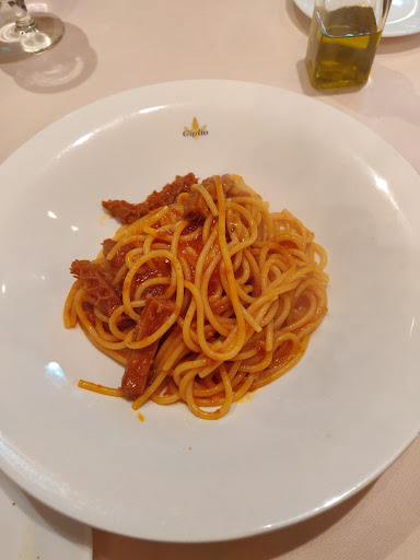 基本的にディナーは2つのコースであり、接待に使うならやはり、フルコースかな、と 奮発し、¥8640のコースを頼みました さてまずはスプマンテを頂きます。 料理は先付け? とうもろこしの冷製スープ、枝豆とパルミジャーノのチップ? 前菜はパルマ産、プロシュート、いろいろなサラミの盛り合わせ、5種類位かな? ものすごく旨い!‼️ なんとゆうか旨味が口の中に広がり 今まで食べてきたものとは別物! 次に運ばれてきた料理は魚 イサキ、ズッキーニ、バンチェッタで巻いた インボルト?トマトのクレーマ! これまたビックリ、焼き方、舌触り 完璧。 思わずスタッフの女性を呼び止めてしまった! バスタは種類 ラビオリ、ニュウディー? 地鶏のラグーソース、イ、ピーチ?