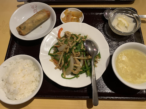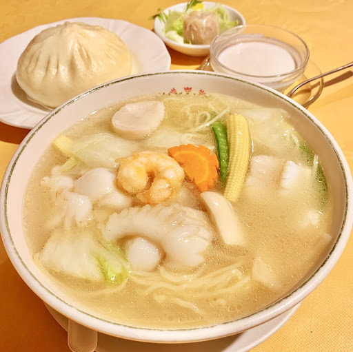 Chinese specialties in a simple dining room with wooden floorboards & framed traditional art.