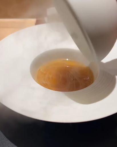 The Toyama Bay, made into a double-layered tartare, with gougere grains on top and bottom, solidified egg yolk and smoked caviar on top. The firefly squid and scallop tartare had a mellow taste, with the saltiness of the smoked caviar combined with the gougere grains on top and bottom, along with the solidified egg yolk creating a perfect complexity. The classic turtle soup Grand Royal, also known as steamed egg custard, had gelatinous flounder on top and clams, mitsuba and celery on top. The soup was a bit light, perfect for an appetizer – very delicate. Foie Gras Mochi is a palate cleanser with foie gras mousse, Kumamoto jam, Grand Marnier orange wine jelly and Pate de campagne – its soft texture complements the sourness of the accompanying corn. The pasta is paired with a delicious sauce made from clams and tomatoes, highlighted by the spicy aroma of harissa, a popular ingredient in Tunisia.
