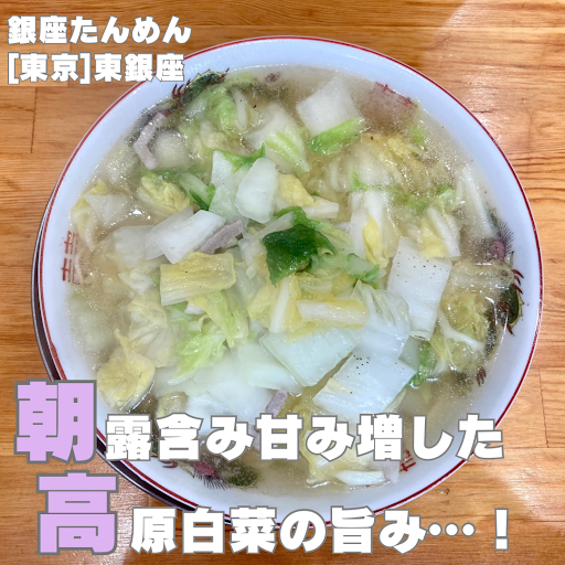 Read more銀座たんめん@ 東京都中央区銀座4-14-3 どうも、さぴおです ______________ 🍥ポイント ✅五臓六腑にしみ渡る…高原の朝露をたっぷり含んで甘さ増した白菜の旨み…! ✅2019年創業のタンメン専門店 ✅土日祝休み  ̄ ̄ ̄ ̄ ̄ ̄ ̄ ̄ ̄ ̄ ̄ ̄ ̄ ̄ [点数] 83点 ☆3.8 [アクセス] 『東銀座駅』(180m) [休日] 土日祝 [注文メニュー] タンメン 1000円 [並び・システム] 並びなし・チケット制 [食材] 動物出汁、香味野菜出汁、白菜、豚肉、中華麺 [味] 塩