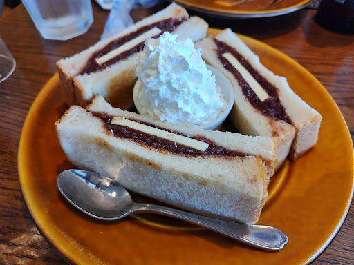 抹茶ラテは本格的な抹茶の味で、甘みはあまりありませんでした。クリームたっぷりの見た目から甘みがあるものと思いましたがそんなこともなく。甘い抹茶の飲食物が好きな人は「思ってたのと違う」ってなるかもしれません。 小倉サンドはメニュー名通り本当にボリュームがあるので、同行者に1切れ食べてもらいました。甘くてクリームもりもりで最高でした。