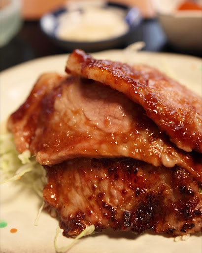 少し時間を置いて 定食形式でお盆にお料理一式。 キャベツをクッションにして ミルフィーユのように重なる生姜焼き。 加えて、酢の物、煮物、漬物、 味噌汁、デザートという充実ぶり。 御飯家というだけあって、 ライスは大盛りもおかわりも無料。 ありがたい。 自家精米というこだわりぶり。 主役の米が美味しいと、脇役の役割は重要。 脇役とは、生姜焼き。 見るからに美味そうなビジュアル。 しっかりタレがつけられた状態で焼かれてる。 香ばしい香りだけで、ライスが進みそう。