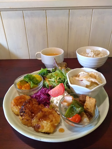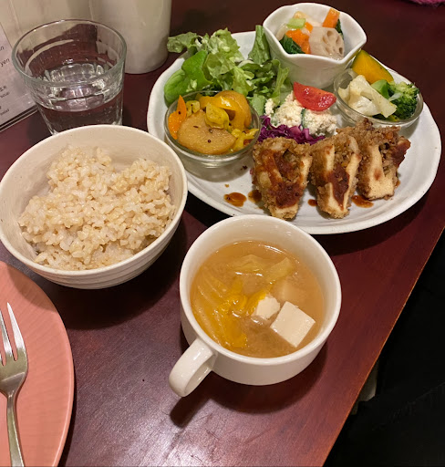 If you like having a quiet space to focus on your food, this place is it. Coming solo is encouraged. Chatter is discouraged. Perfect for a brief respite from the hustle and bustle of the world outside. There's only one person managing everything, but being the first customer in at lunch time, I didn't have to wait very long for my meal. And although customer service - on the phone and in person - was on the reserved side, she worked quickly and efficiently. The food was in the style of homecooking, nothing amazing, just simple, comforting and nourishing; I particularly liked the okara salad. The lunch set was surprisingly filling for the size, but dessert goes into a different belly, so I ordered dessert and a cereal coffee. The oatmilk creme brulee had a crispy sweet top, but was pretty bland. The matcha marble cake, though, was really yummy, moist with nice crunchy cookie bits on top for contrast, and was the highlight of the meal for me. And it all came to a very reasonable 1600yen. I would come again if I was in the area, but I wouldn't go out of my way to come here. There are other vegan restaurants with similar fare closer to where I live. And apart from the cake, nothing really makes this place stand out more from the others. In addition, the lack of bicycle parking really adds to the effort of coming...