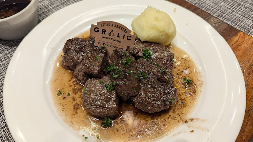 I've been in Japan for almost 2 weeks eating mostly sushi, Ramen, and various pick up meals from the grocery/conbini as I walked by this restaurant going to my hotel, I savoured the smells as I walked by trying to hold off until I was having the day of highest notes(just finished a tour to fuji-san), and tonight was the night, I walked in, to a greeting from the chef and gesture to take a seat front row to this gloriously seared taste show. The menu while succinct I could immediately tell the concept had much thought and a refinement of effort, of gratuitous portions. While they also had an incredible list of adult imbibables I don't partake but was instantly relieved once I saw glass bottle coca-cola(the best way). I had the garlic rice&soup combo, 250g tenderloin(very well priced for the quality that was incipient) accompanied by the garlic butter, and seared onions. Before I even begin to eat I was beyond stoked at what was coming, and then a healthy cabbage salad came out first I didn't even order with this outstanding garlic dressing with lemon that brought the exacting amount of acid needed. Then my rice and soup arrive, the soup; light but bold broth with scallions atop and the rice; inside garlic, scallion, egg, rice, seared perfectly to bring in a layer of umami and top with yet more garlic, the crispy kind, mhwa. As I begin start my journey of flavortude, criss grossing bites, maximizing the gifts each dish brought to each other; I watched the chef(Yon/Yot? I may have misheard in my post meal flavor euphoria) add generous splash of dark liquid(either some sort or sweetend soy sauce or worcestershire) atop what i saw was a just breaking out of rare tenderloin and a touch a flame, I immediately knew this man, no, meat diety, knew what he was doing. As I waited(briefly) like a child during the last minutes before summer break, the server(a very sweet woman, whose name I should have asked for), came bearing my scale modeled meaty version of fuji-san topped not with snow l, but the glorious half golden onions. Now. Now I was ready for the denouement. The side of zucchini, and the cold subletly sweet garlic(which caught me off gaurd as first, but immediately regretted my doubt as I consumed) brought everything else i had hoped for to this experience. The way the steak was cooked brought me back to my days of working at "the cannibal" of LA, excellently seasoned with deep umami, and robustly rounded sweetness from aforementioned brown sauce reduce, but I was not done there, I immediately restarted my criss-cross of plates, bits and bites of each; together, separate, all savoured, all internalized into a deeply embedded flavour memory. Akin to recalling in awe, after someone captures a core memory of a meal cooked by a loved one from your youth. I type this post meal raconteur, as I smoke a cigarette wondering when or I dare I say, if, I'll be able to eat anything even half this good again. Gralic, chef, I whole heartedly say,...