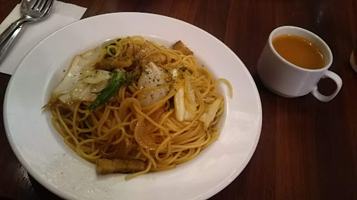 Exceptionally cheap "Spanish" restaurant. Lunch menu has about five dishes under 1000 yen with small salad and all-you-can-drink soup and cold orange juice, oolong and coffee.