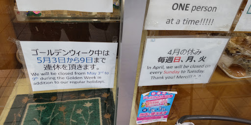 揚げないタイプの辛口カレーパンや、アンパン、クリームパン、シフォンケーキ、杏や梨のタルトもおいしい。今年2023年GWの休業日は写真の通り。英訳が拙いのはご愛嬌。