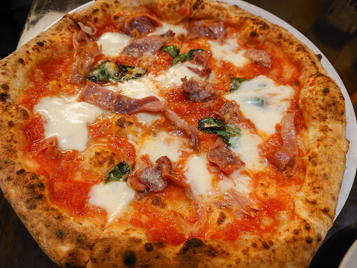 マルゲリータに生ハムを乗せて焼いたピッツァ。 もっちりとした生地に、割としっかり酸味の効いたトマトソースと生ハムの塩気が相性良いですね。