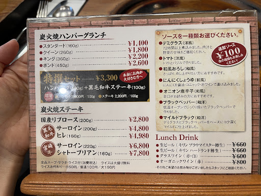 〇メニュー ハンバーグとステーキが中心のメニュー構成。 ハンバーグはサイズを選べ、男性にはボリューム満点の「ポンド(450g)」が、女性には程よい「クイーン(260g)」が人気。 ソースは7種類から選べ、迷ったときは定番のデミグラスがおすすめです。